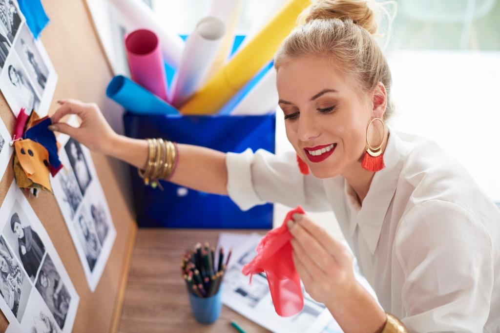 Handwäsche mit mildem Waschmittel, kaltes Wasser und sanftes Ausdrücken im Handtuch bewahren Form. Spanne feucht auf einer Pinnwand, achte auf rechte Winkel und schonende Nadeln. Teste immer die Markierstifte. Teile deine Routine und Lieblingsprodukte in den Kommentaren.